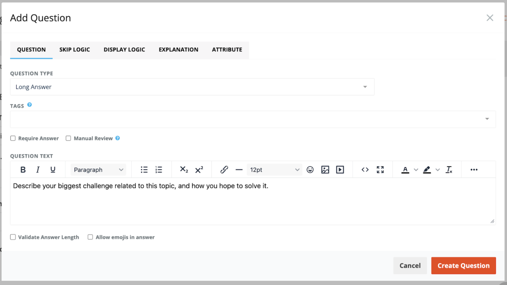 This option lets participants include emojis in their Long Answer response. If the checkbox is not enabled, only standard text characters will be accepted.