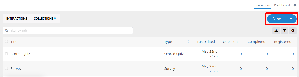 To create content, click "New" in the dashboard and select the type of interaction you want to build.