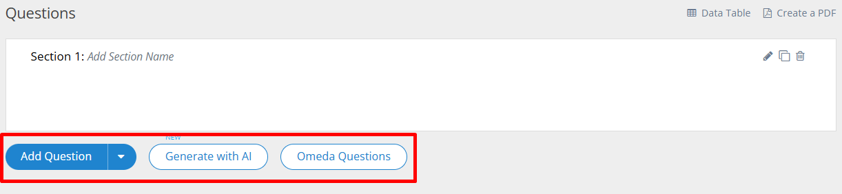 Questions created using CredSpark-native tools or AI generation are not automatically linked to Omeda.