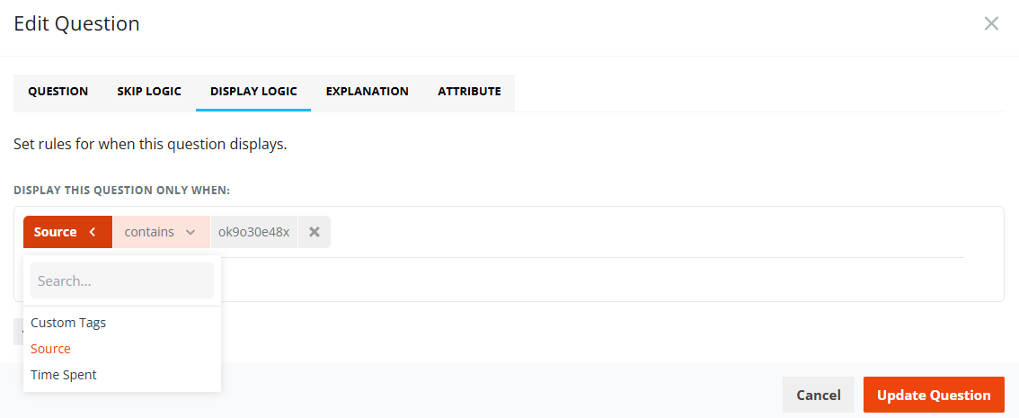 Next, open the interaction in CredSpark and select the question you want to tailor. Navigate to Display Logic, choose Source, and paste the pathway code into the field.