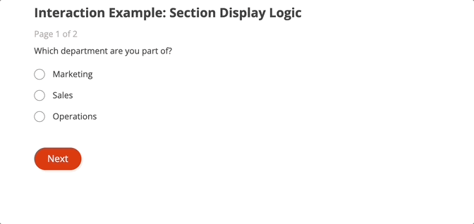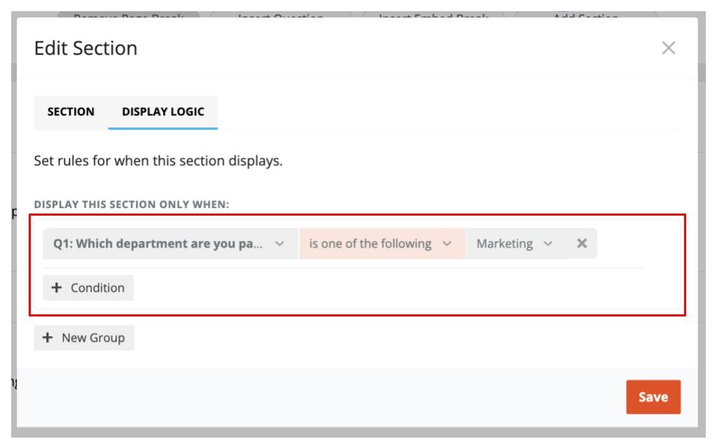 Section Display Logic lets you control when a section is surfaced for users, based on a participant’s previous answers and other response information (eg. custom tags and time spent), and hidden fields. This is helpful when you have a group of questions that should only appear under certain conditions.